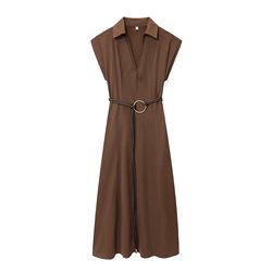 KAR & OT ZA 2025 otoño nueva moda Simple Slim Fit cuello en V sin mangas A-line con cinturón Midi vestido 5029168